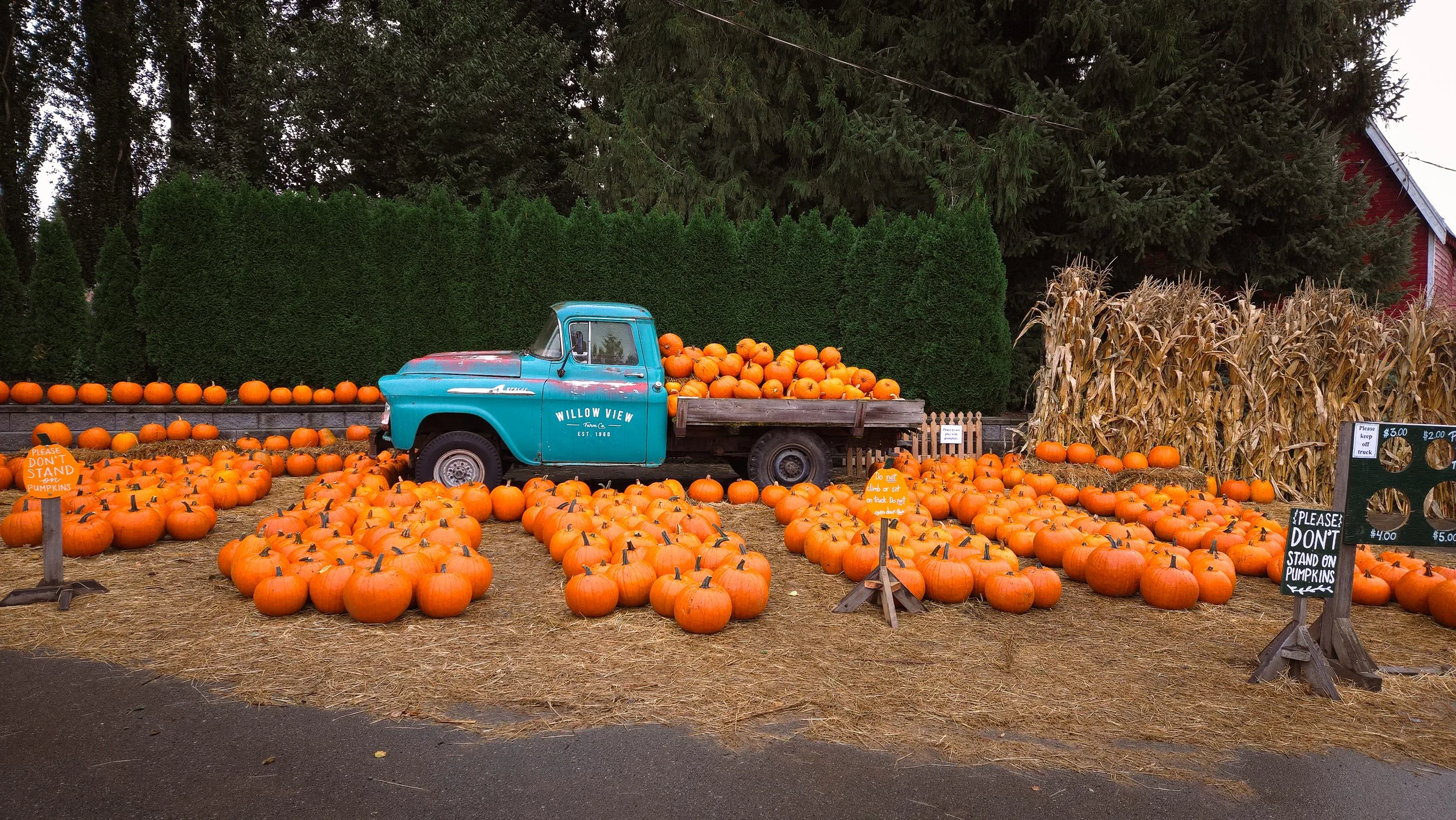 We have regular orange pumpkins, a selection of specialty pumpkins (red, white, blue, and pink varieties), as well as squash available for purchase in our yard displays in September and October.